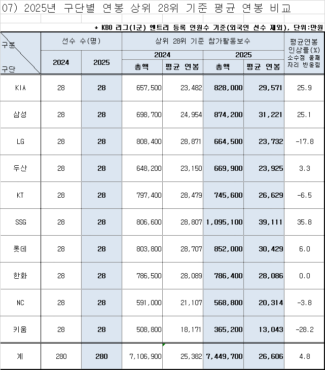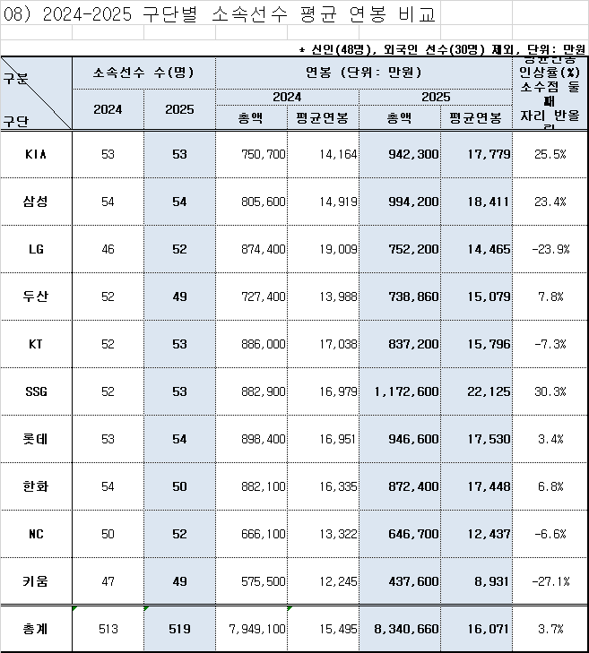 특히 각 구단의 평균 연봉 인상률이 눈에 띄는데요. 먼저 구단별 연봉 변화를 자세히 살펴볼게요. 👇