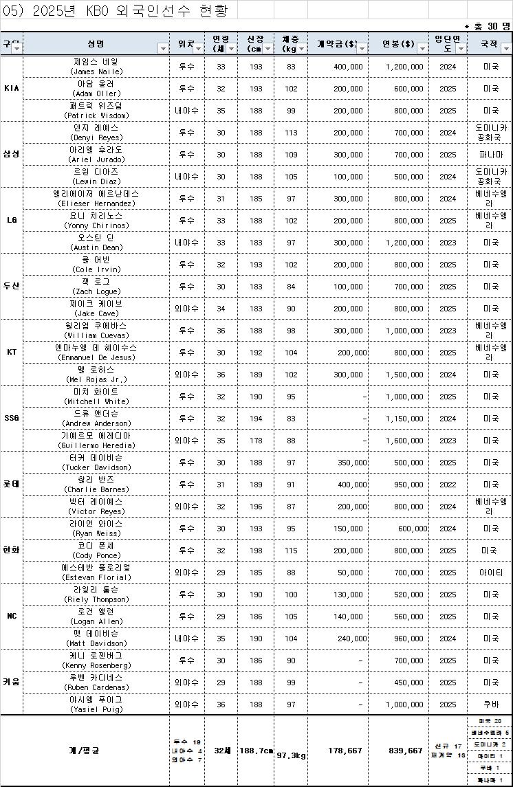 외국인 선수 중 KT의 로하스가 180만 달러로 1위를 차지했어요. 그 뒤를 KIA의 네일과 SSG의 에레디아가 160만 달러로 이었어요. 국적 비율을 보면 미국 국적이 전체 30명 중 20명으로 가장 많네요!