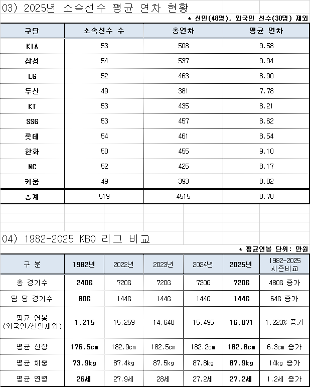 ⚾ 소속선수 평균 연차 현황 📅 82~25 KBO 리그 비교 |