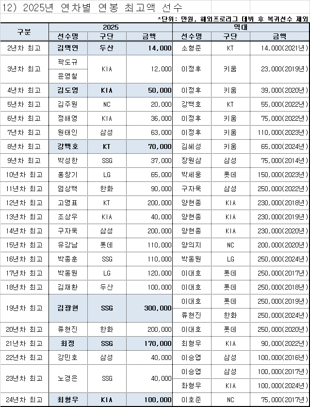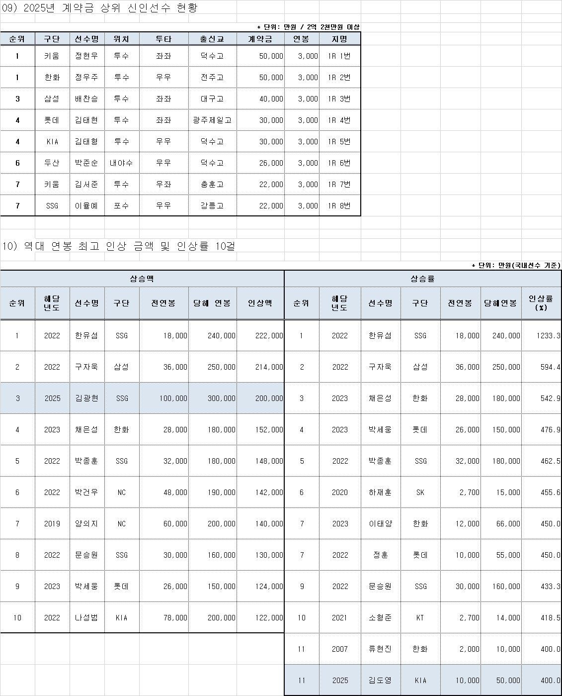 | 🧑 계약금 상위 신인선수 현황 🔺 역대 연봉 인상률 TOP 10 |