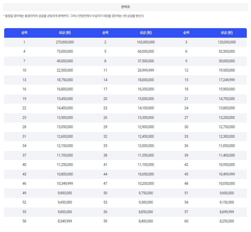 | 우승상금 | 2억 7천만 원 / 순위별 상금 정보 👈 |