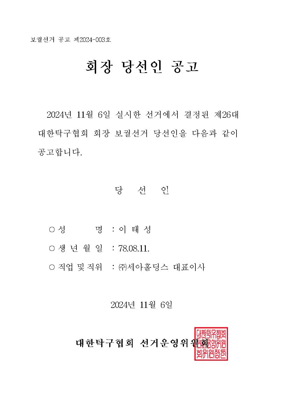이태성 당선인은 젊고 혁신적인 1978년생 기업가인데요, 탁구에 대한 깊은 애정으로 꾸준히 대한탁구협회를 후원해 온 인물이죠. 👏