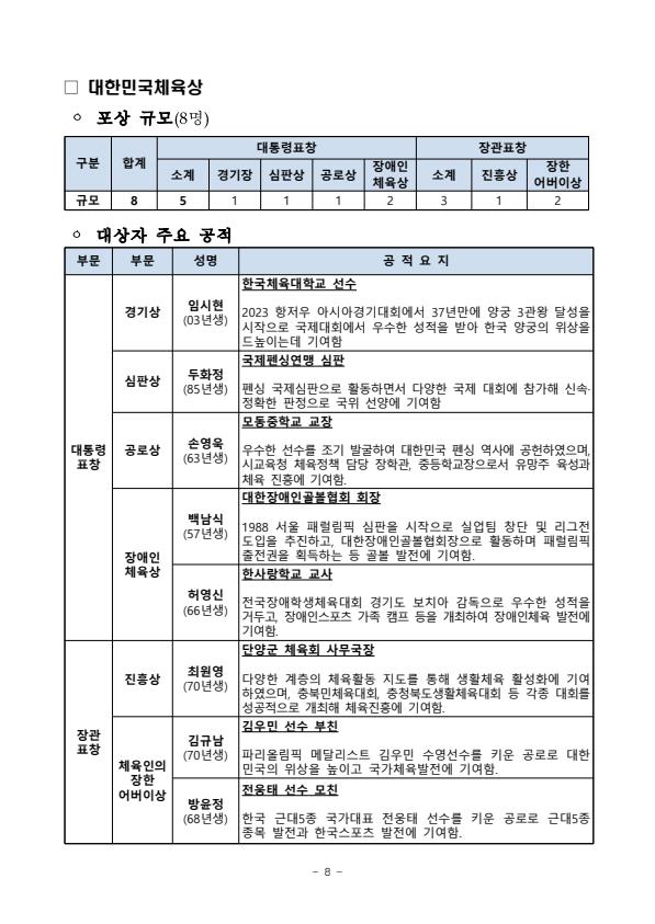 대한민국체육상은 1963년 제정된 상으로, 국민 체육 발전에 공적이 있는 사람들에게 수여되는 상인데요, 올해는 총 8명의 수상자가 선정되었고, 대통령 표창문체부 장관 표창 두 가지로 나뉘어 수여되었어요. 🙌