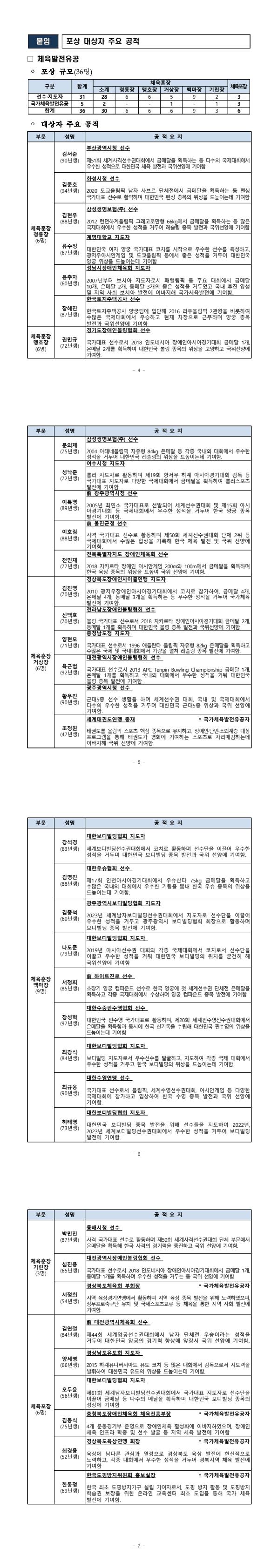이번 포상은 체육훈장 청룡장을 비롯한 다양한 훈장을 받은 30명과 체육포장을 받은 6명으로 구분되어 있어요. 💪