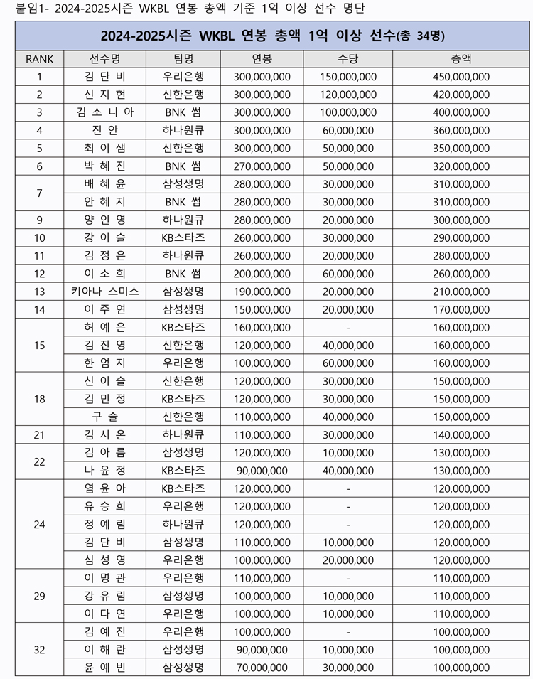 | 1위 | 김단비 | 우리은행 | 3억 원 | 1억 5천만 원 | 4억 5천만 원 |
