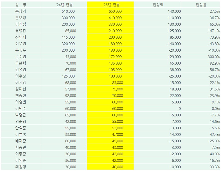 | 선수명 | 2024년 연봉(천 원) | 2025년 연봉(천 원) | 인상액(천 원) | 인상률(%) |