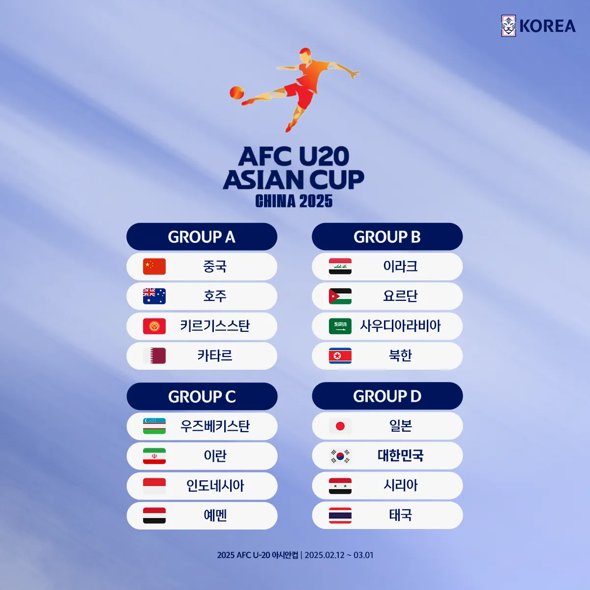 ![2025 AFC U-20 중국 아시안컵 - 본선 경기 일정 & 대표팀 명단! [시리아전 태국전 한일전 D조 조별리그 중계 결과]](https://blog.kakaocdn.net/dna/KwFuo/btsMlhAeuUk/AAAAAAAAAAAAAAAAAAAAANoyxS55mx_qKbUbbaghxapqTZAJrh6NnzIGG1vQ0iIv/img.webp?credential=yqXZFxpELC7KVnFOS48ylbz2pIh7yKj8&expires=1777561199&allow_ip=&allow_referer=&signature=NIiIPsU2Ey1LGYTAsMJoC1oQ98Y%3D)