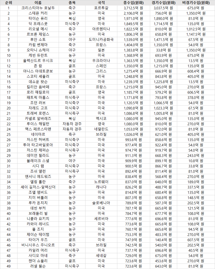 이번 수입 순위를 보면 이제는 단순 경기력만으로는 세계 1위에 오를 수 없다는 점이 보여요.