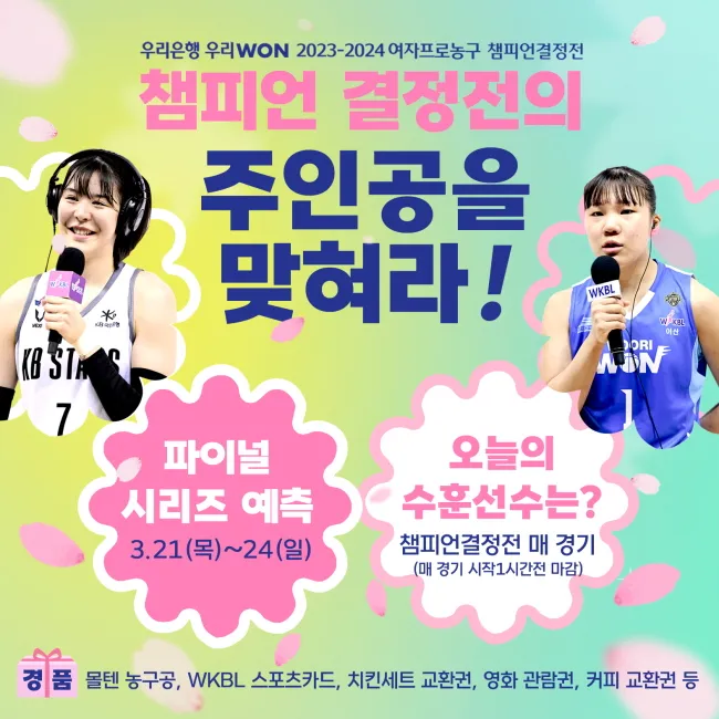 또한, WKBL은 팬들을 위한 SNS 이벤트를 마련했습니다. WKBL 공식 인스타그램에서 진행되는 이 이벤트는 '파이널 시리즈 예측'과 '오늘의 수훈 선수 맞히기'를 포함하며, 참여하신 분들 중 추첨을 통해 멋진 상품을 제공할 예정입니다!